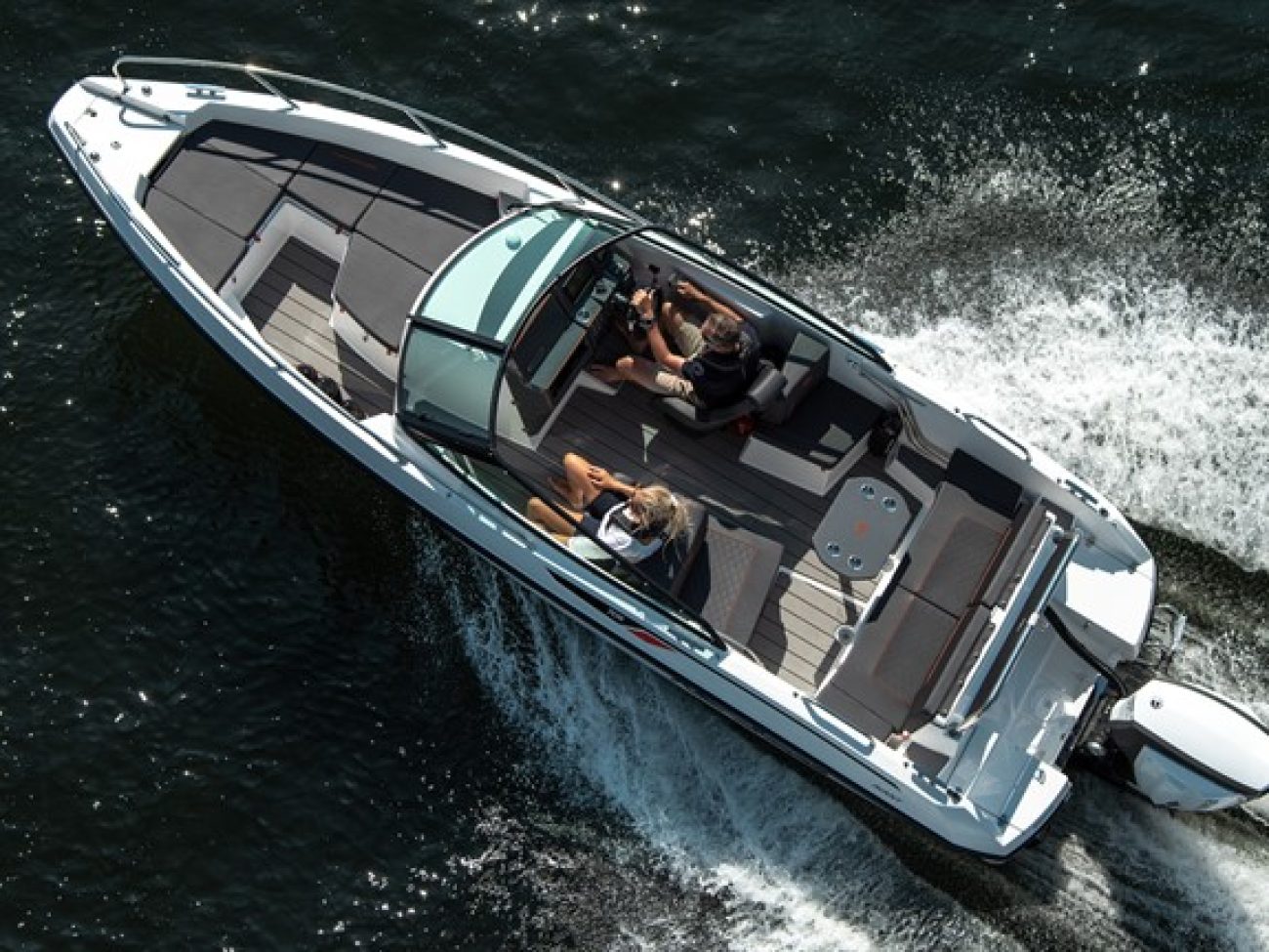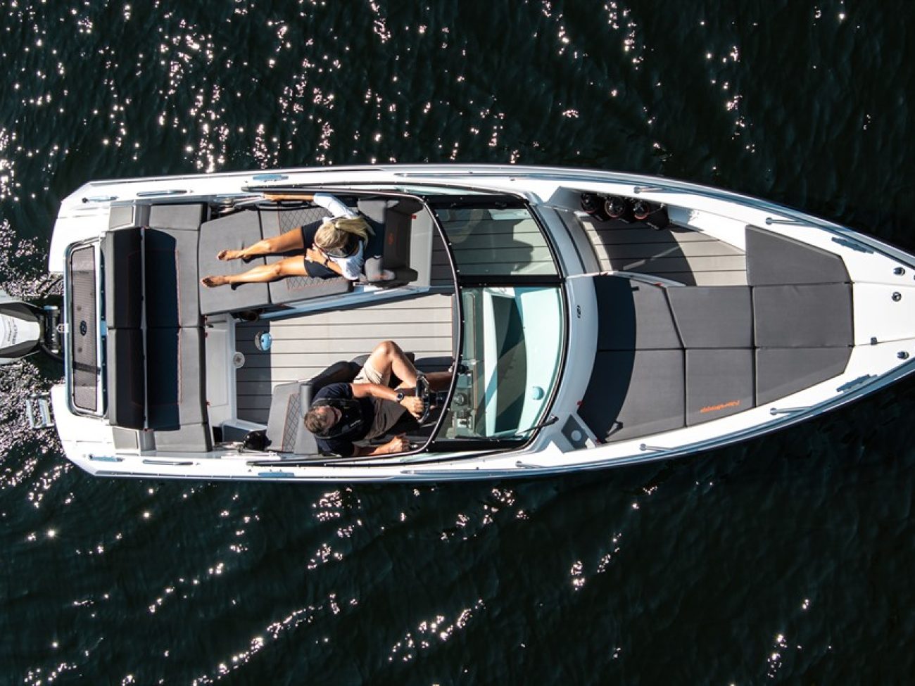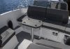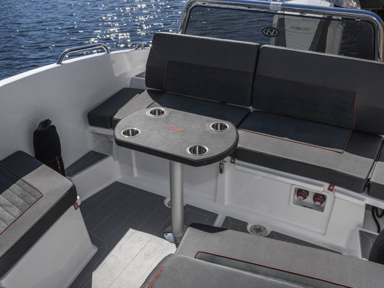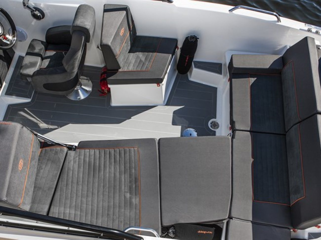 Sur la poupe avec la table un espace convivial est créer grâce au siège pilote et passager qui se tourne face à la banquette avant. A la proue l’espace assise peut se transformer en grand bain de soleil pour profiter pleinement des plaisirs de la mer.