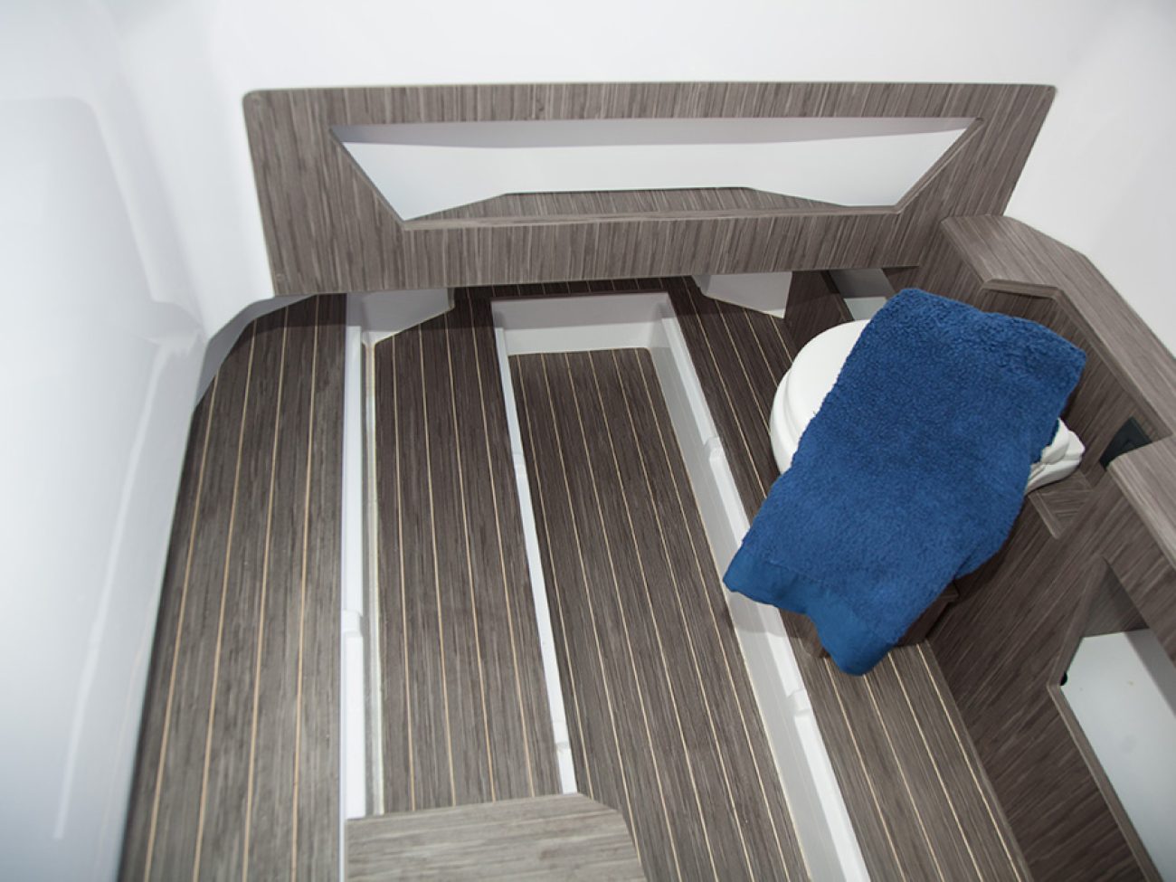 Sur la partie cabine on retrouve des rangements ainsi que la possibilité d’installer un WC.