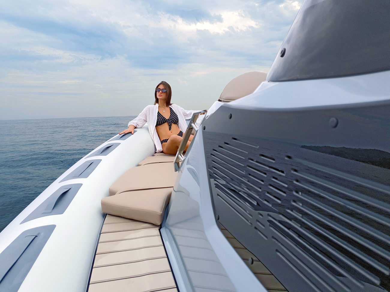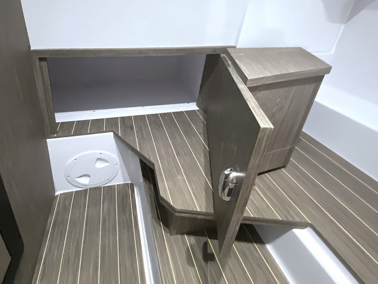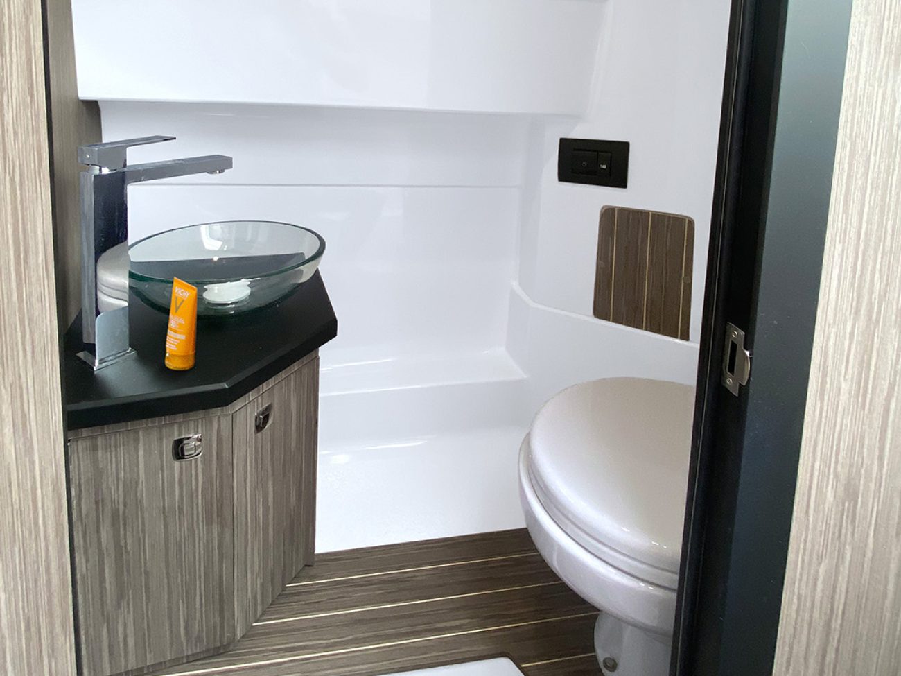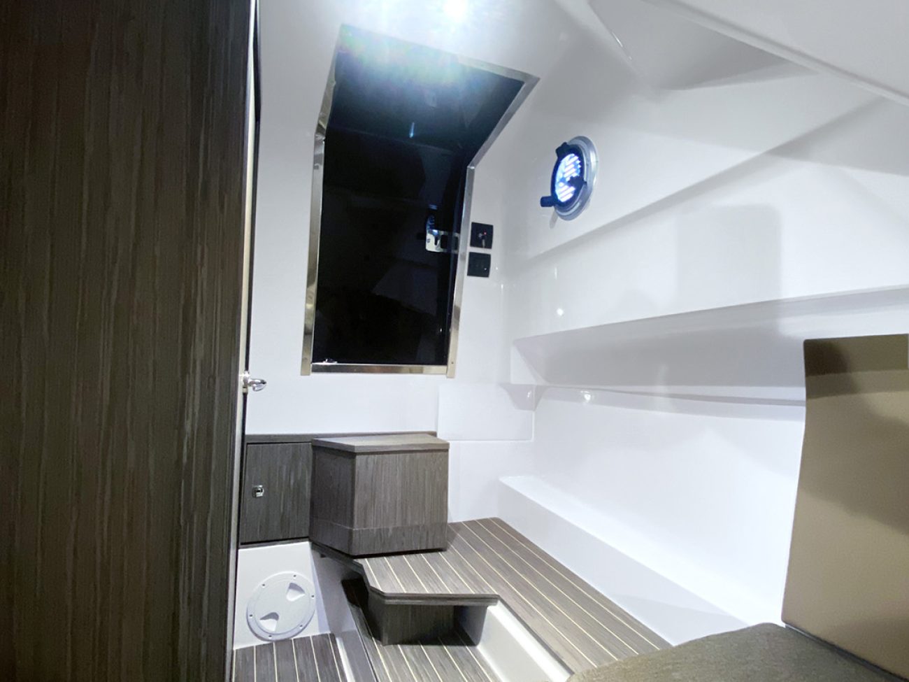 La console soignée dispose d’un tableau de bord luxury pouvant accueillir de nombreux équipements électronique. L’accès à la console est pratique, on retrouve un WC et un réfrigérateur tiroir, avec de nombreux rangements ainsi que des hublots latéraux.