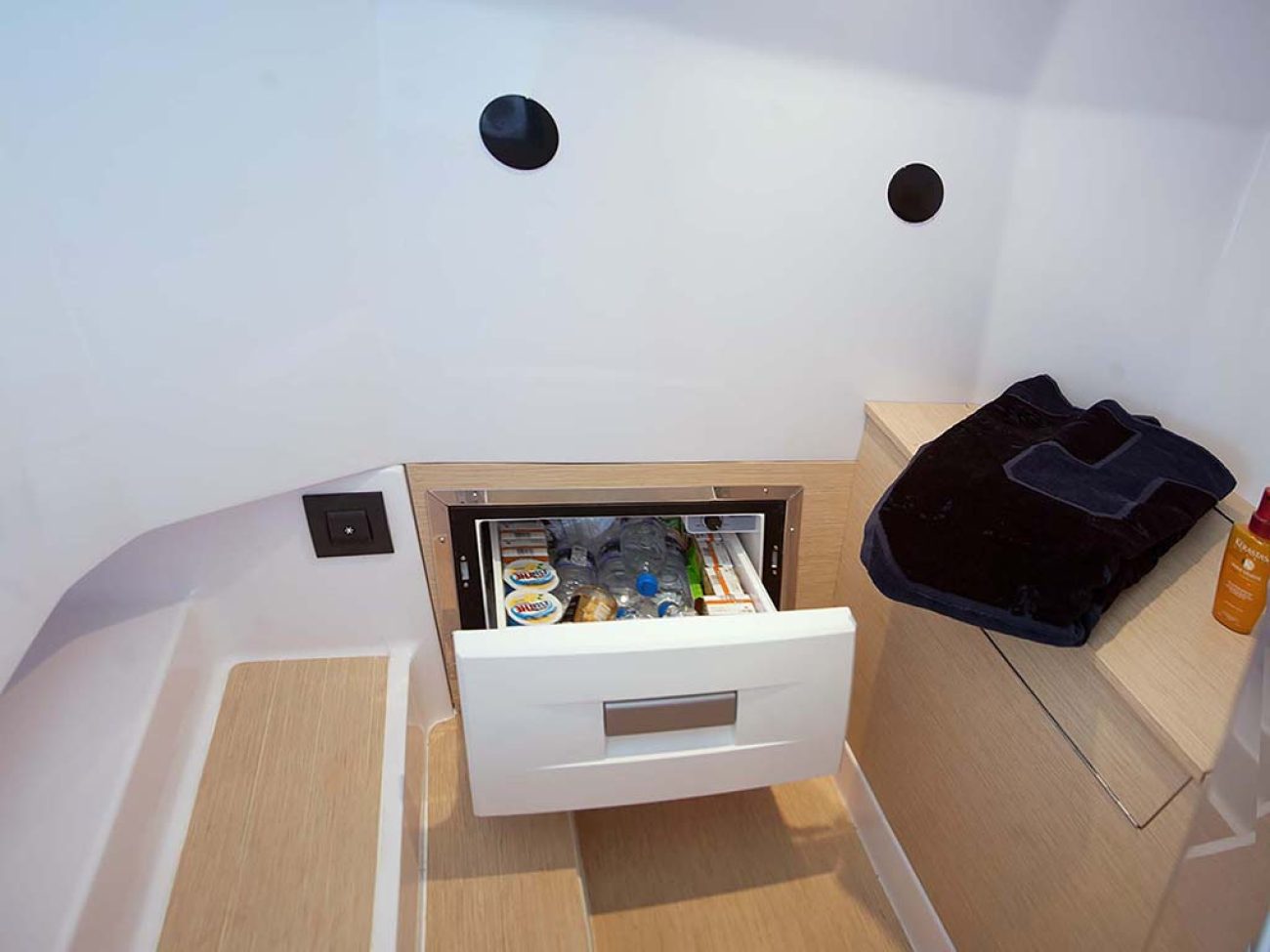 L’accès à la console est pratique, on retrouve un WC et un réfrigérateur tiroir, avec de nombreux rangements ainsi que des hublots latéraux.
