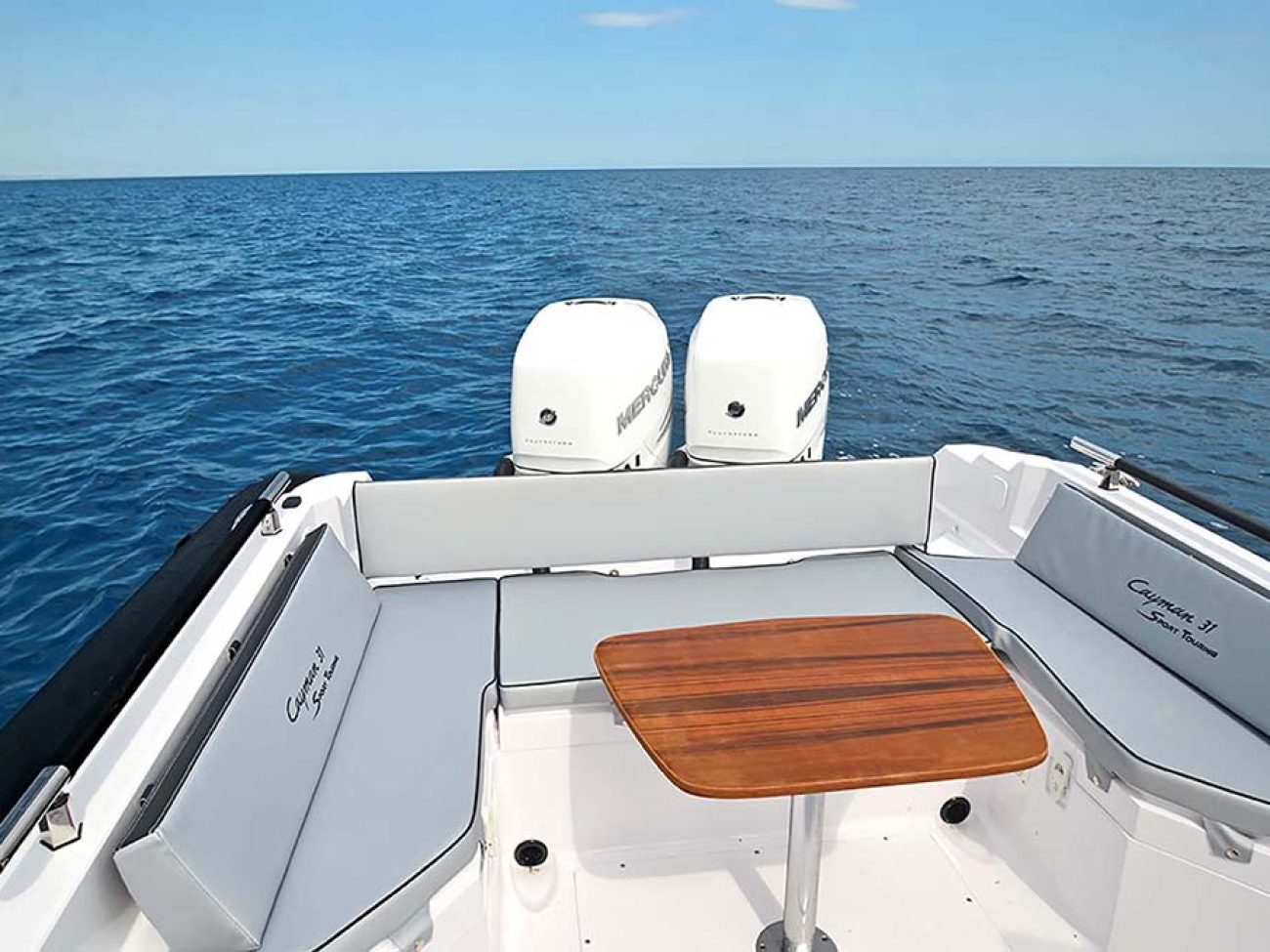 A la poupe le Cayman 31 SPORT TOURING , dispose de plate-formes arrières avec échelle escamotable encastré à bâbord, ce qui facilite et rend agréable la baignade.