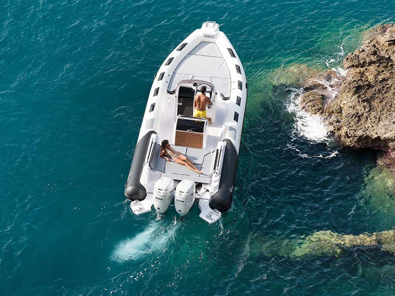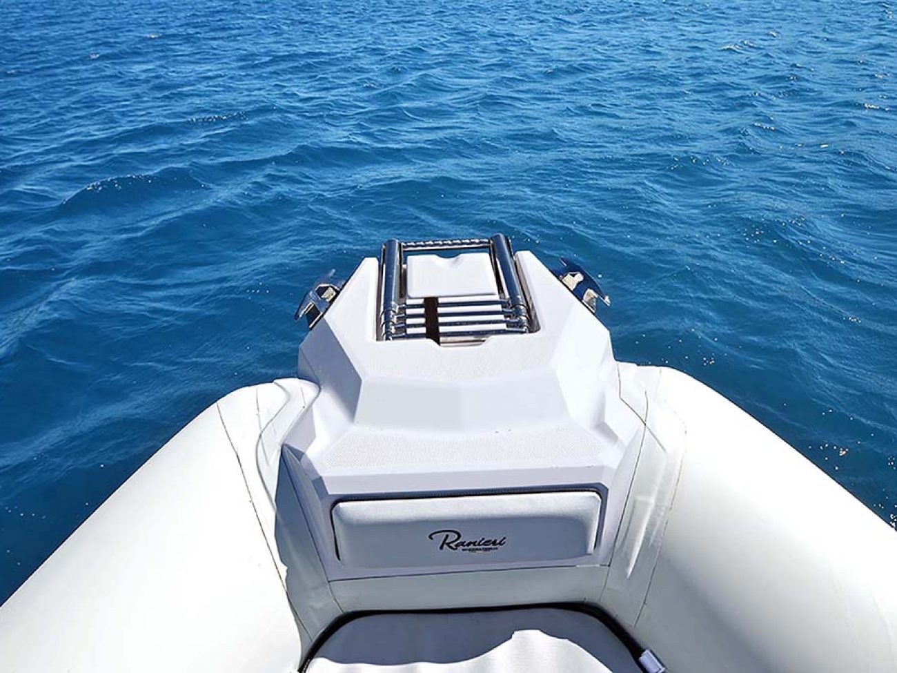 On retrouve un grand bain de soleil convivial et agréable qui sera très apprécié et convoité lors de vos sorties.Sa proue effilé avec son nez en fibre de verre dispose de série d’un guindeau électrique, ainsi que d’une échelle.
