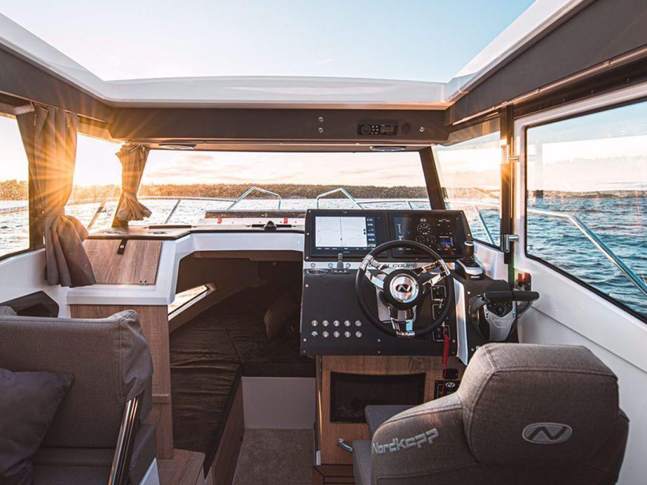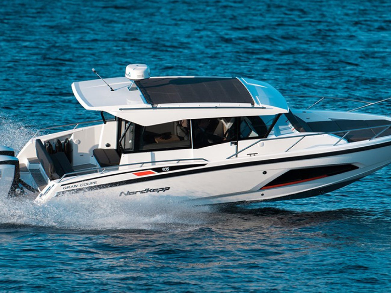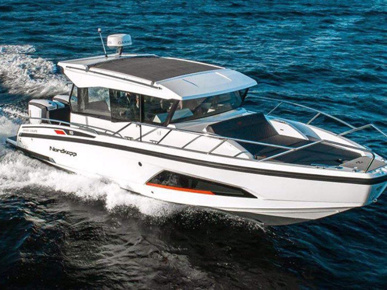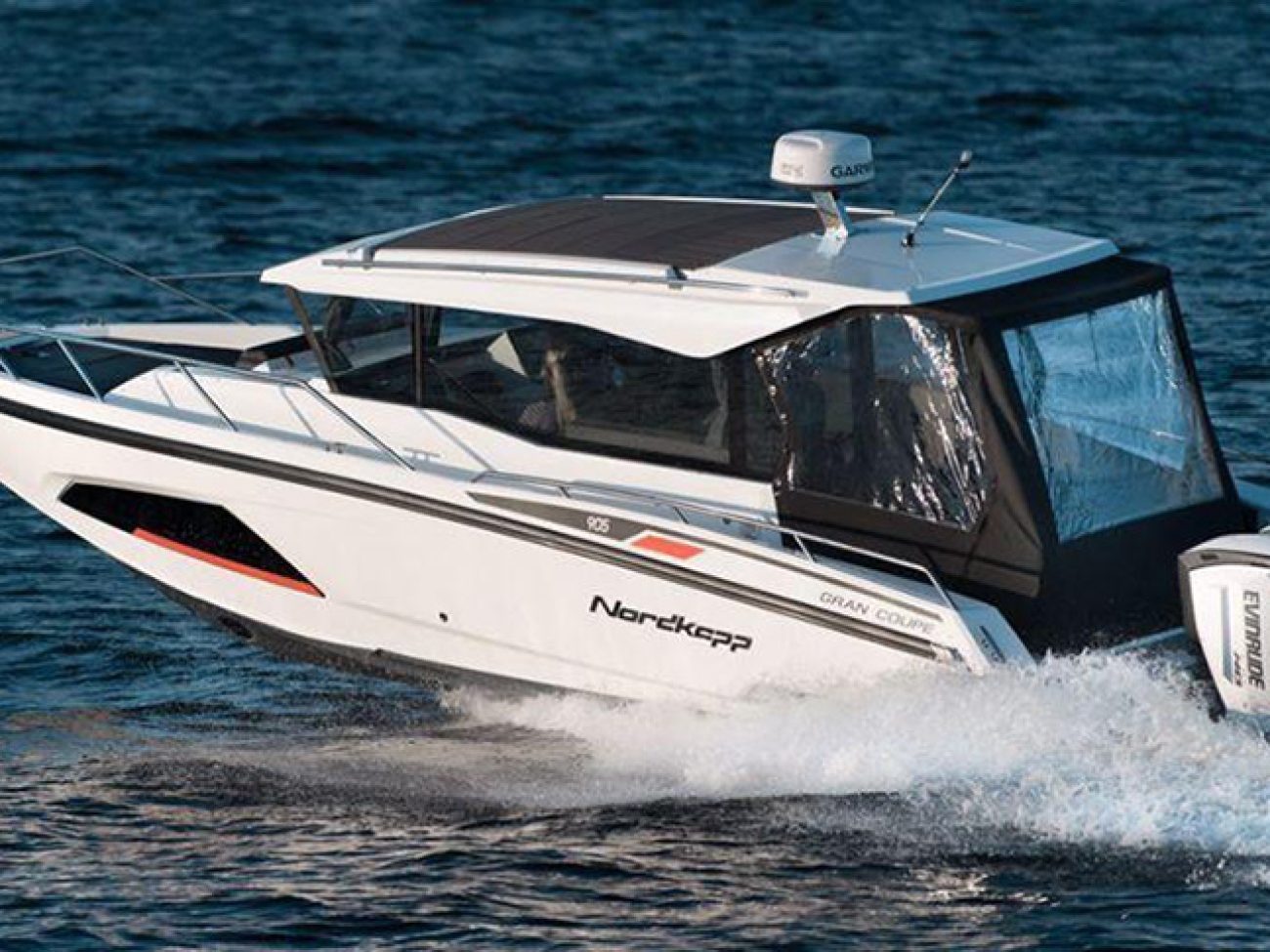 Un résultat a coupé le souffle, puisque ce bateau coupé, est familial et à la fois sportif , il a tout ce qu’il faut et ainsi il se démarque largement de la concurrence.Après plusieurs années de développement voici le nouveau bateau Nordkapp c’est aussi le premier bateau avec un toit et une aussi grande cabine avec salle de bain. En effet la hauteur dans la cabine est de 1,98m. Comme sa réputation, Nordkapp un bateau de qualité, solide et haut de gamme. Son isolation est remarquable, et sa navigation sensationnelle. Le Grand Coupé 905 est très maniable avec un très bon passage en mer ainsi un très bon angle d’attaque, à vitesse de croisière comme à grande vitesse, il sera ravir aussi bien le pilote que les passagers. Il serai impossible de décrire l’ensemble des équipements, ingéniosités ou détails, mais nous allons essayer de vous le présenter. A l’intérieur un cockpit complètement modulable.Un spacieux coin repas avec table et siège, plaque de cuisson ainsi qu’un frigo. Cet espace peut se transformer en canapé ou lit d’appoint. Le siège pilote a une ergonomie a couper le souffle et son tableau de bord a été pensé pour avoir un maximum d’équipements. Dans la cabine avec ses 1,98m de hauteur sous barreaux, une spacieuse cabine avec couchages. Un toit ouvrant sur l’extérieur, des lumières LED ainsi que de belles verrière. A tribord une salle de bain avec WC douche et lavabo, vous permettrons d’avoir tout le confort pour vos croisière en famille. De nombreuses ouvertures sur le Grand Coupé 905 rendent se bateau utilisable en toutes saisons, tout ouvert par beau temps, ou à l’abri lorsqu’il fait plus frais. Son toit électrique ouvrant, sa porte latérale tribord, sa porte arrière sur le pont permettent d’avoir de grands espaces conviviaux. En option la possibilité d’un taud de camping pour fermer le carré arrière et ainsi avec un espace extrêmement vaste. La partie arrière est complètement amovible. Tout peut-être enlever (banquette et table), et au contraire un bain de soleil bâbord peut-être installé, ainsi qu’une table.De larges passavants vous permettrons en toute sécurité de rejoindre le grand bain de soleil avant. On retrouve la marque de fabrique de l’esprit familial et sécuritaire avec ses hauts francs bords et de nombreuses mains courantes.