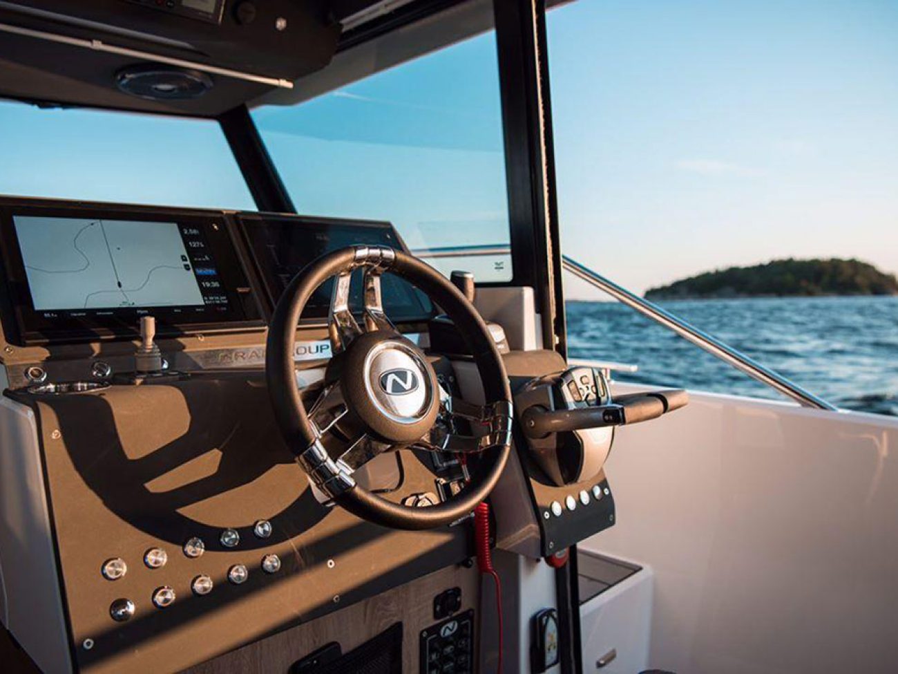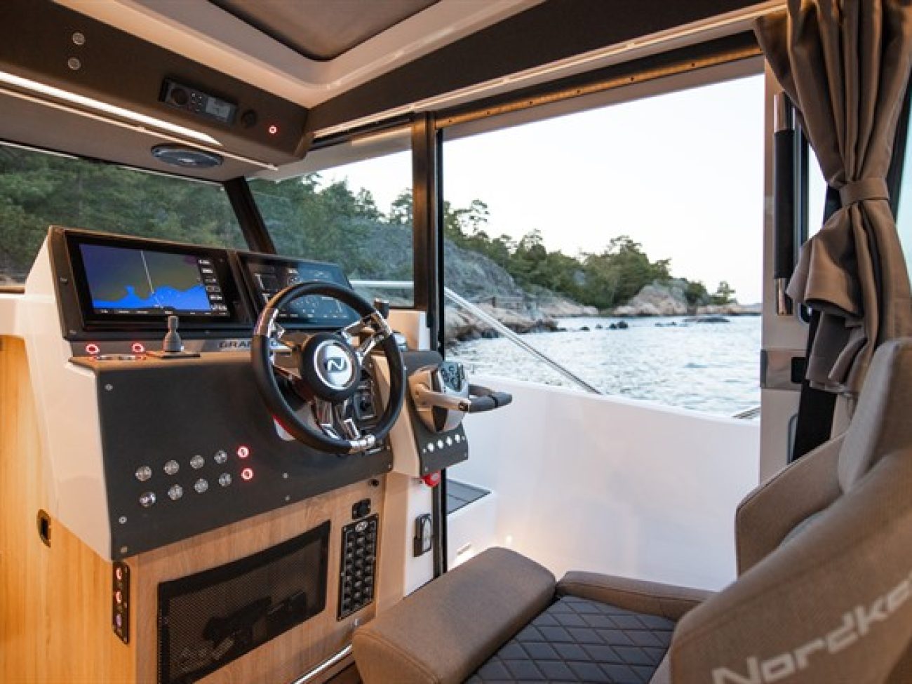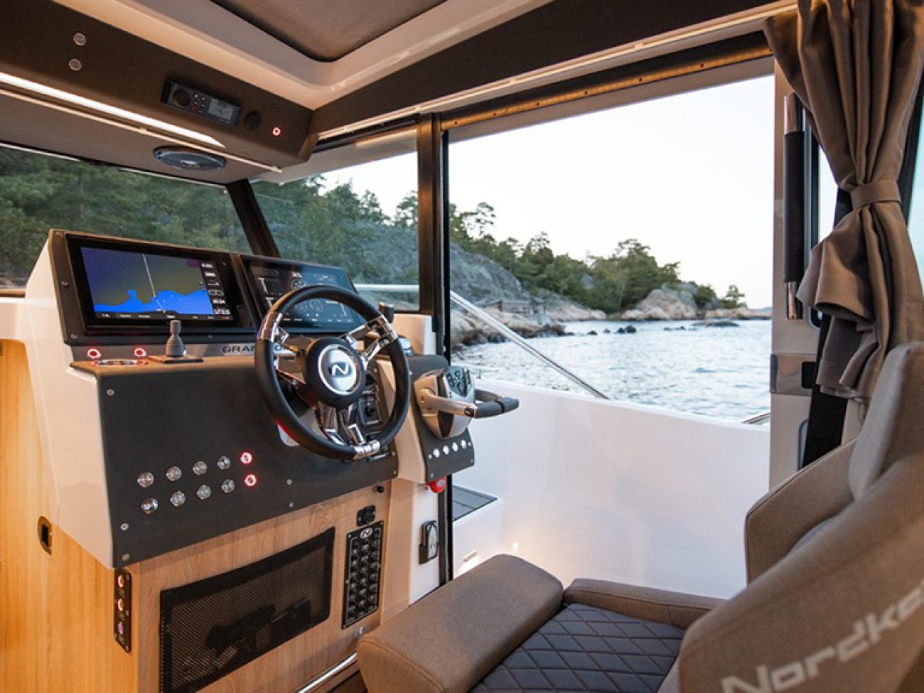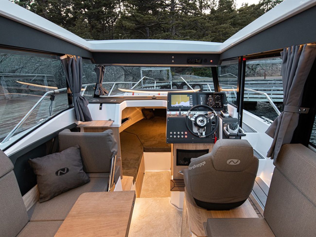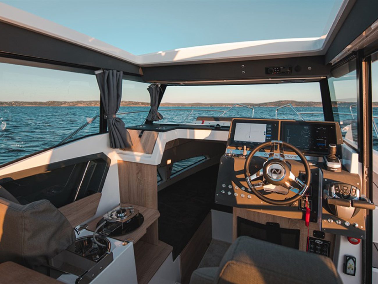 Un résultat a coupé le souffle, puisque ce bateau coupé, est familial et à la fois sportif , il a tout ce qu’il faut et ainsi il se démarque largement de la concurrence.Après plusieurs années de développement voici le nouveau bateau Nordkapp c’est aussi le premier bateau avec un toit et une aussi grande cabine avec salle de bain. En effet la hauteur dans la cabine est de 1,98m. Comme sa réputation, Nordkapp un bateau de qualité, solide et haut de gamme. Son isolation est remarquable, et sa navigation sensationnelle. Le Grand Coupé 905 est très maniable avec un très bon passage en mer ainsi un très bon angle d’attaque, à vitesse de croisière comme à grande vitesse, il sera ravir aussi bien le pilote que les passagers. Il serai impossible de décrire l’ensemble des équipements, ingéniosités ou détails, mais nous allons essayer de vous le présenter. A l’intérieur un cockpit complètement modulable.Un spacieux coin repas avec table et siège, plaque de cuisson ainsi qu’un frigo. Cet espace peut se transformer en canapé ou lit d’appoint. Le siège pilote a une ergonomie a couper le souffle et son tableau de bord a été pensé pour avoir un maximum d’équipements. Dans la cabine avec ses 1,98m de hauteur sous barreaux, une spacieuse cabine avec couchages. Un toit ouvrant sur l’extérieur, des lumières LED ainsi que de belles verrière. A tribord une salle de bain avec WC douche et lavabo, vous permettrons d’avoir tout le confort pour vos croisière en famille. De nombreuses ouvertures sur le Grand Coupé 905 rendent se bateau utilisable en toutes saisons, tout ouvert par beau temps, ou à l’abri lorsqu’il fait plus frais. Son toit électrique ouvrant, sa porte latérale tribord, sa porte arrière sur le pont permettent d’avoir de grands espaces conviviaux. En option la possibilité d’un taud de camping pour fermer le carré arrière et ainsi avec un espace extrêmement vaste. La partie arrière est complètement amovible. Tout peut-être enlever (banquette et table), et au contraire un bain de soleil bâbord peut-être installé, ainsi qu’une table.De larges passavants vous permettrons en toute sécurité de rejoindre le grand bain de soleil avant. On retrouve la marque de fabrique de l’esprit familial et sécuritaire avec ses hauts francs bords et de nombreuses mains courantes.