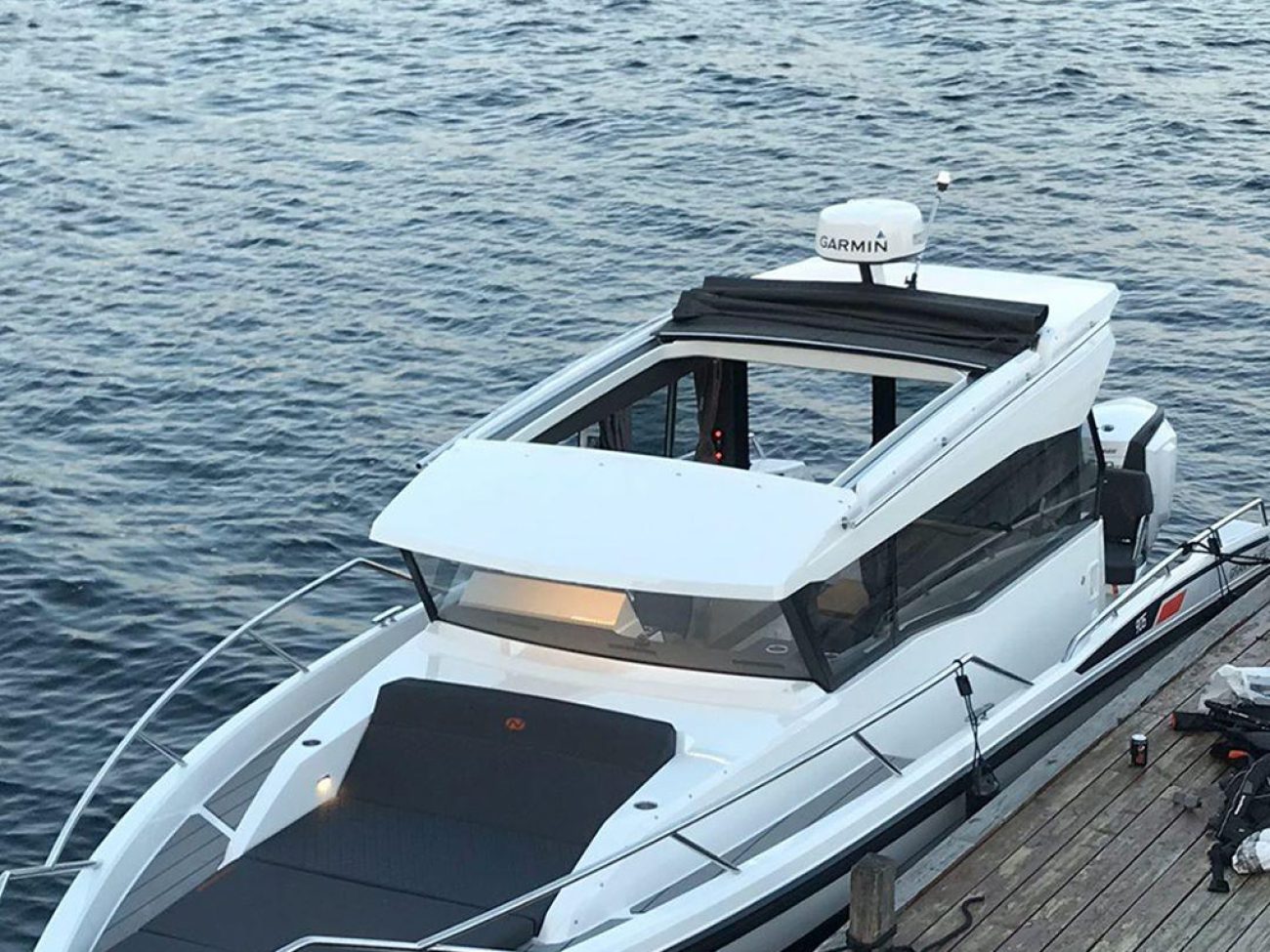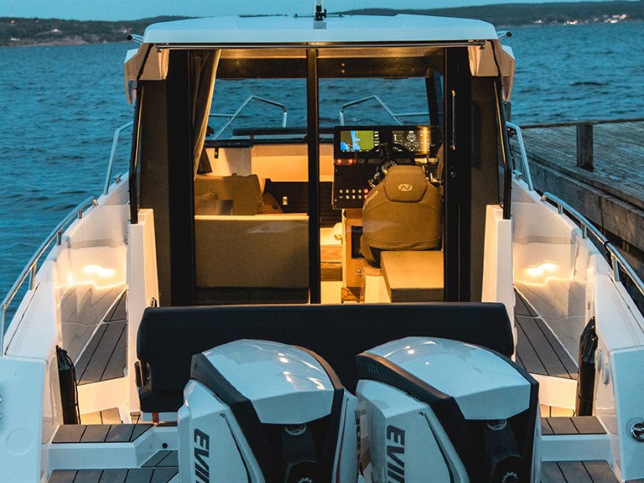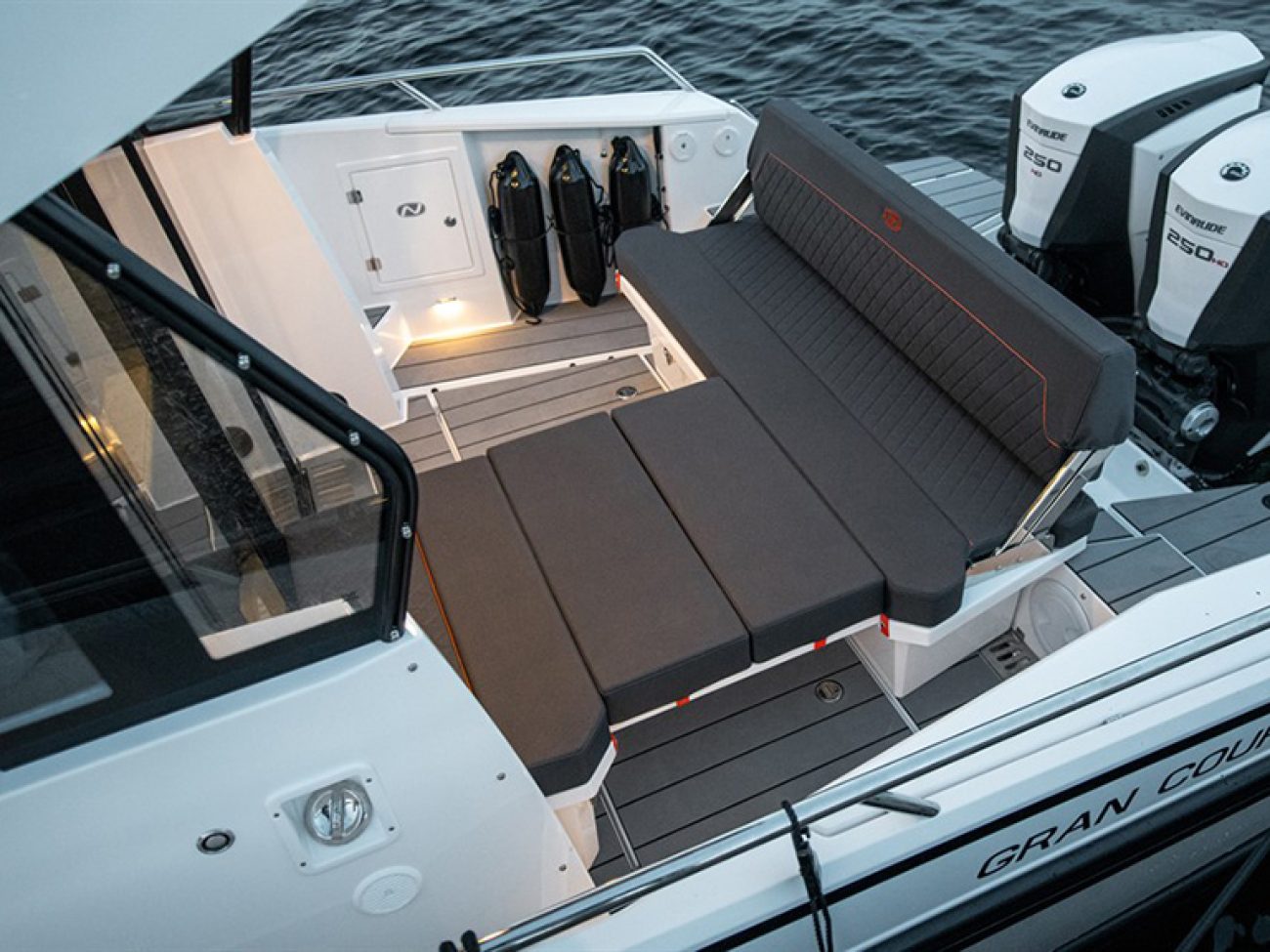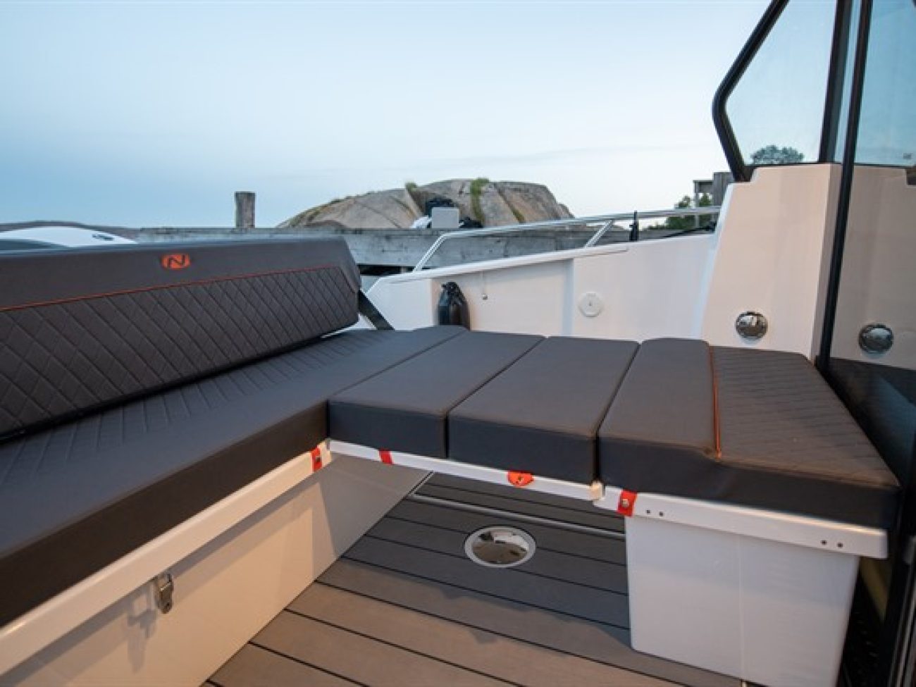 Un résultat a coupé le souffle, puisque ce bateau coupé, est familial et à la fois sportif , il a tout ce qu’il faut et ainsi il se démarque largement de la concurrence.Après plusieurs années de développement voici le nouveau bateau Nordkapp c’est aussi le premier bateau avec un toit et une aussi grande cabine avec salle de bain. En effet la hauteur dans la cabine est de 1,98m. Comme sa réputation, Nordkapp un bateau de qualité, solide et haut de gamme. Son isolation est remarquable, et sa navigation sensationnelle. Le Grand Coupé 905 est très maniable avec un très bon passage en mer ainsi un très bon angle d’attaque, à vitesse de croisière comme à grande vitesse, il sera ravir aussi bien le pilote que les passagers. Il serai impossible de décrire l’ensemble des équipements, ingéniosités ou détails, mais nous allons essayer de vous le présenter. A l’intérieur un cockpit complètement modulable.Un spacieux coin repas avec table et siège, plaque de cuisson ainsi qu’un frigo. Cet espace peut se transformer en canapé ou lit d’appoint. Le siège pilote a une ergonomie a couper le souffle et son tableau de bord a été pensé pour avoir un maximum d’équipements. Dans la cabine avec ses 1,98m de hauteur sous barreaux, une spacieuse cabine avec couchages. Un toit ouvrant sur l’extérieur, des lumières LED ainsi que de belles verrière. A tribord une salle de bain avec WC douche et lavabo, vous permettrons d’avoir tout le confort pour vos croisière en famille. De nombreuses ouvertures sur le Grand Coupé 905 rendent se bateau utilisable en toutes saisons, tout ouvert par beau temps, ou à l’abri lorsqu’il fait plus frais. Son toit électrique ouvrant, sa porte latérale tribord, sa porte arrière sur le pont permettent d’avoir de grands espaces conviviaux. En option la possibilité d’un taud de camping pour fermer le carré arrière et ainsi avec un espace extrêmement vaste. La partie arrière est complètement amovible. Tout peut-être enlever (banquette et table), et au contraire un bain de soleil bâbord peut-être installé, ainsi qu’une table.De larges passavants vous permettrons en toute sécurité de rejoindre le grand bain de soleil avant. On retrouve la marque de fabrique de l’esprit familial et sécuritaire avec ses hauts francs bords et de nombreuses mains courantes.
