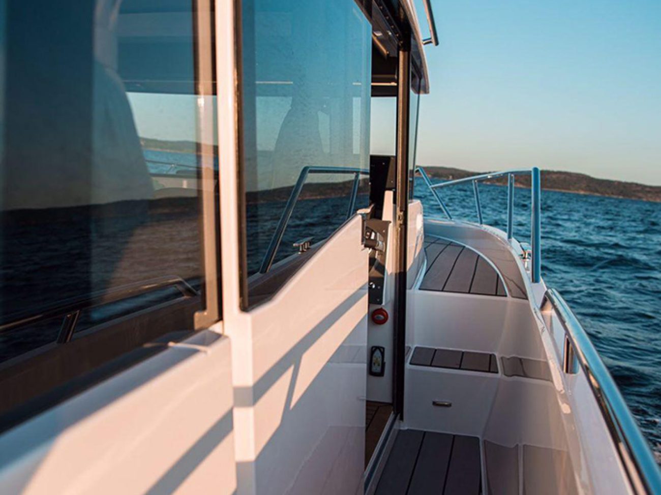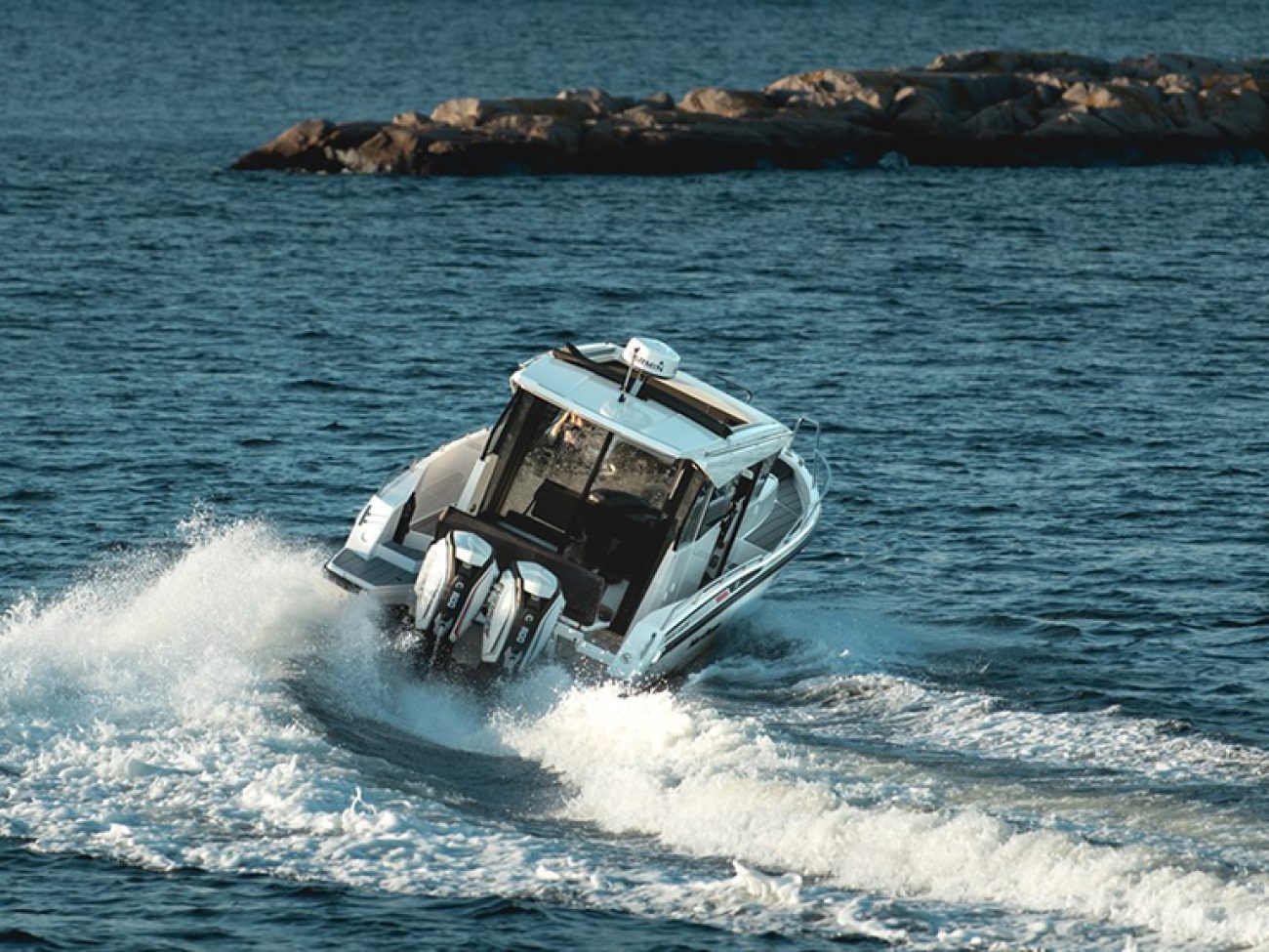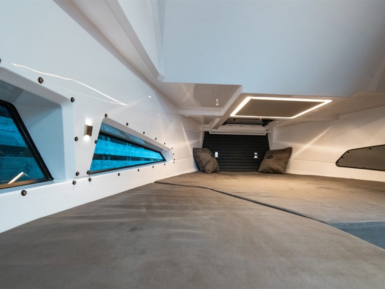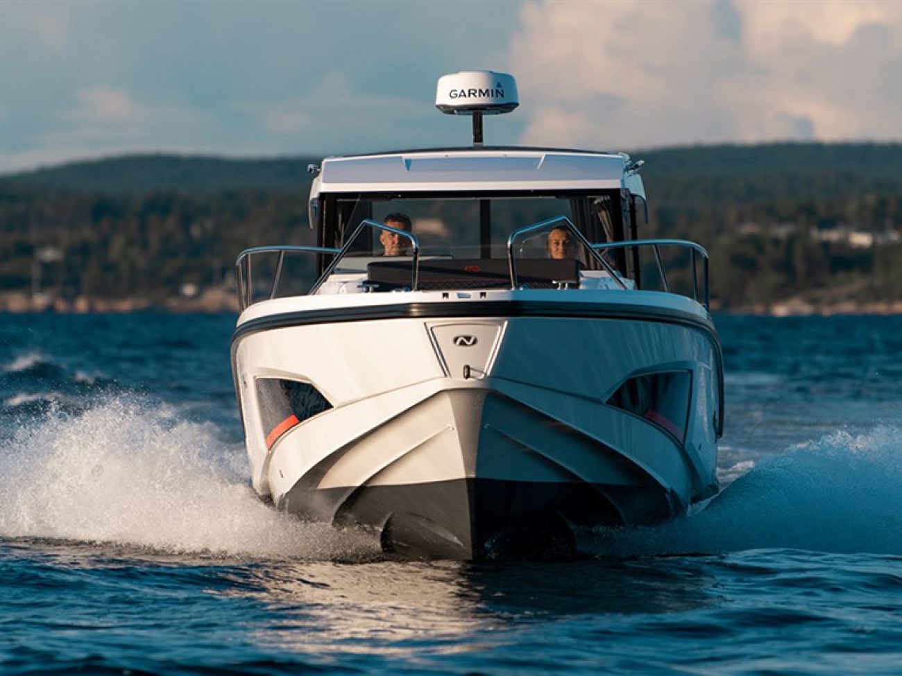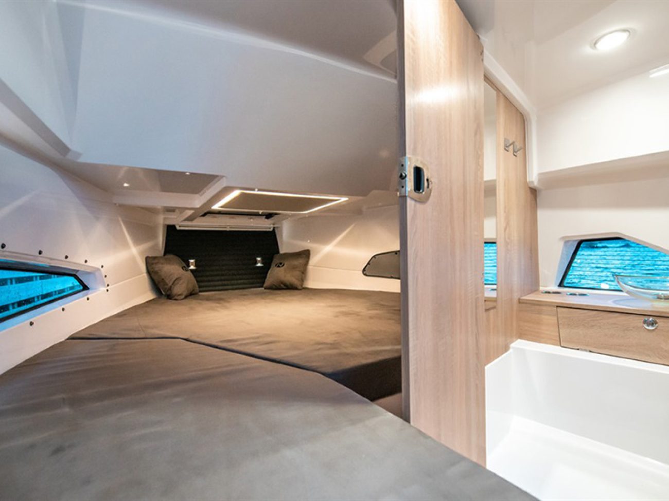 Un résultat a coupé le souffle, puisque ce bateau coupé, est familial et à la fois sportif , il a tout ce qu’il faut et ainsi il se démarque largement de la concurrence.Après plusieurs années de développement voici le nouveau bateau Nordkapp c’est aussi le premier bateau avec un toit et une aussi grande cabine avec salle de bain. En effet la hauteur dans la cabine est de 1,98m. Comme sa réputation, Nordkapp un bateau de qualité, solide et haut de gamme. Son isolation est remarquable, et sa navigation sensationnelle. Le Grand Coupé 905 est très maniable avec un très bon passage en mer ainsi un très bon angle d’attaque, à vitesse de croisière comme à grande vitesse, il sera ravir aussi bien le pilote que les passagers. Il serai impossible de décrire l’ensemble des équipements, ingéniosités ou détails, mais nous allons essayer de vous le présenter. A l’intérieur un cockpit complètement modulable.Un spacieux coin repas avec table et siège, plaque de cuisson ainsi qu’un frigo. Cet espace peut se transformer en canapé ou lit d’appoint. Le siège pilote a une ergonomie a couper le souffle et son tableau de bord a été pensé pour avoir un maximum d’équipements. Dans la cabine avec ses 1,98m de hauteur sous barreaux, une spacieuse cabine avec couchages. Un toit ouvrant sur l’extérieur, des lumières LED ainsi que de belles verrière. A tribord une salle de bain avec WC douche et lavabo, vous permettrons d’avoir tout le confort pour vos croisière en famille. De nombreuses ouvertures sur le Grand Coupé 905 rendent se bateau utilisable en toutes saisons, tout ouvert par beau temps, ou à l’abri lorsqu’il fait plus frais. Son toit électrique ouvrant, sa porte latérale tribord, sa porte arrière sur le pont permettent d’avoir de grands espaces conviviaux. En option la possibilité d’un taud de camping pour fermer le carré arrière et ainsi avec un espace extrêmement vaste. La partie arrière est complètement amovible. Tout peut-être enlever (banquette et table), et au contraire un bain de soleil bâbord peut-être installé, ainsi qu’une table.De larges passavants vous permettrons en toute sécurité de rejoindre le grand bain de soleil avant. On retrouve la marque de fabrique de l’esprit familial et sécuritaire avec ses hauts francs bords et de nombreuses mains courantes.
