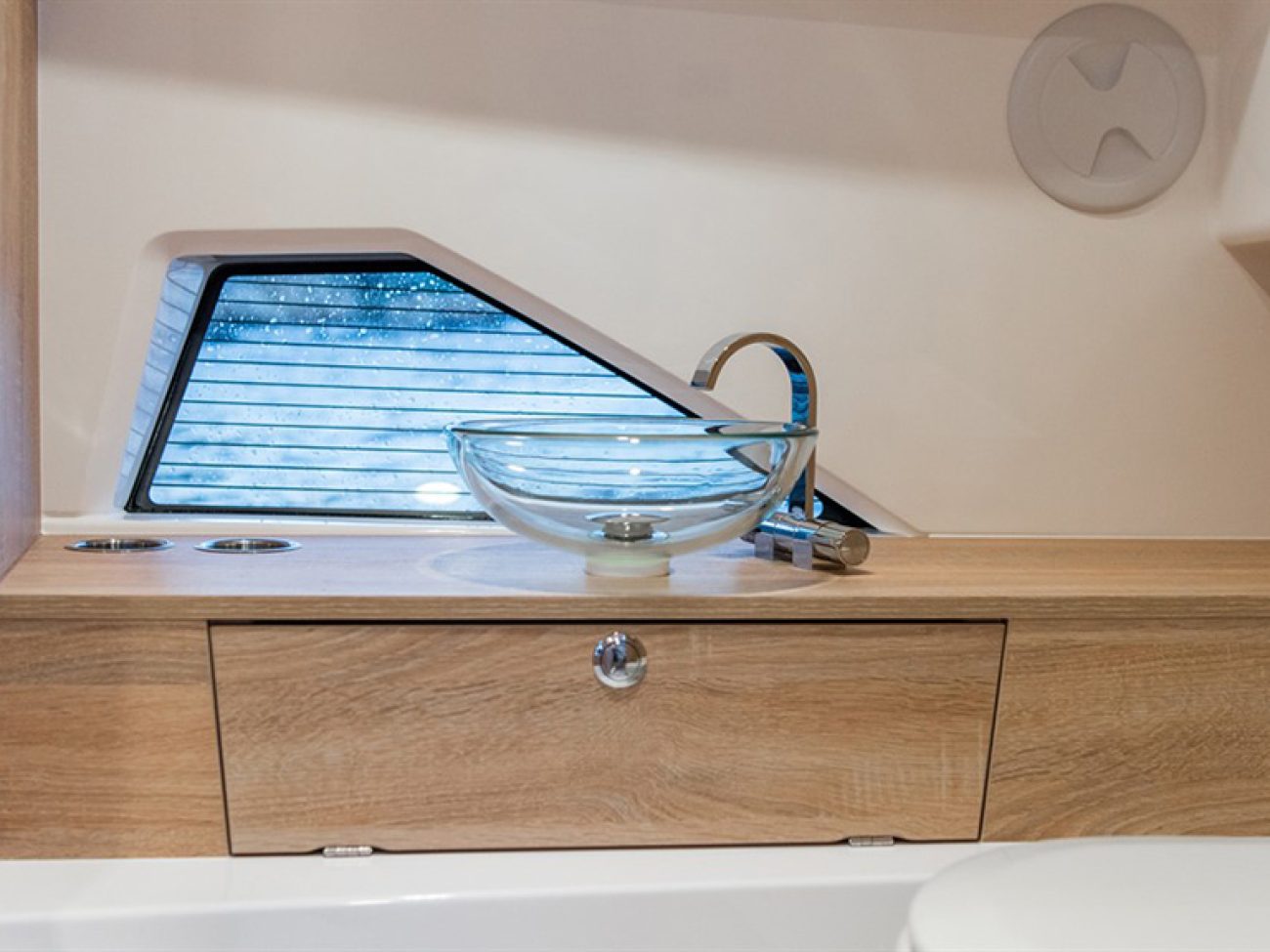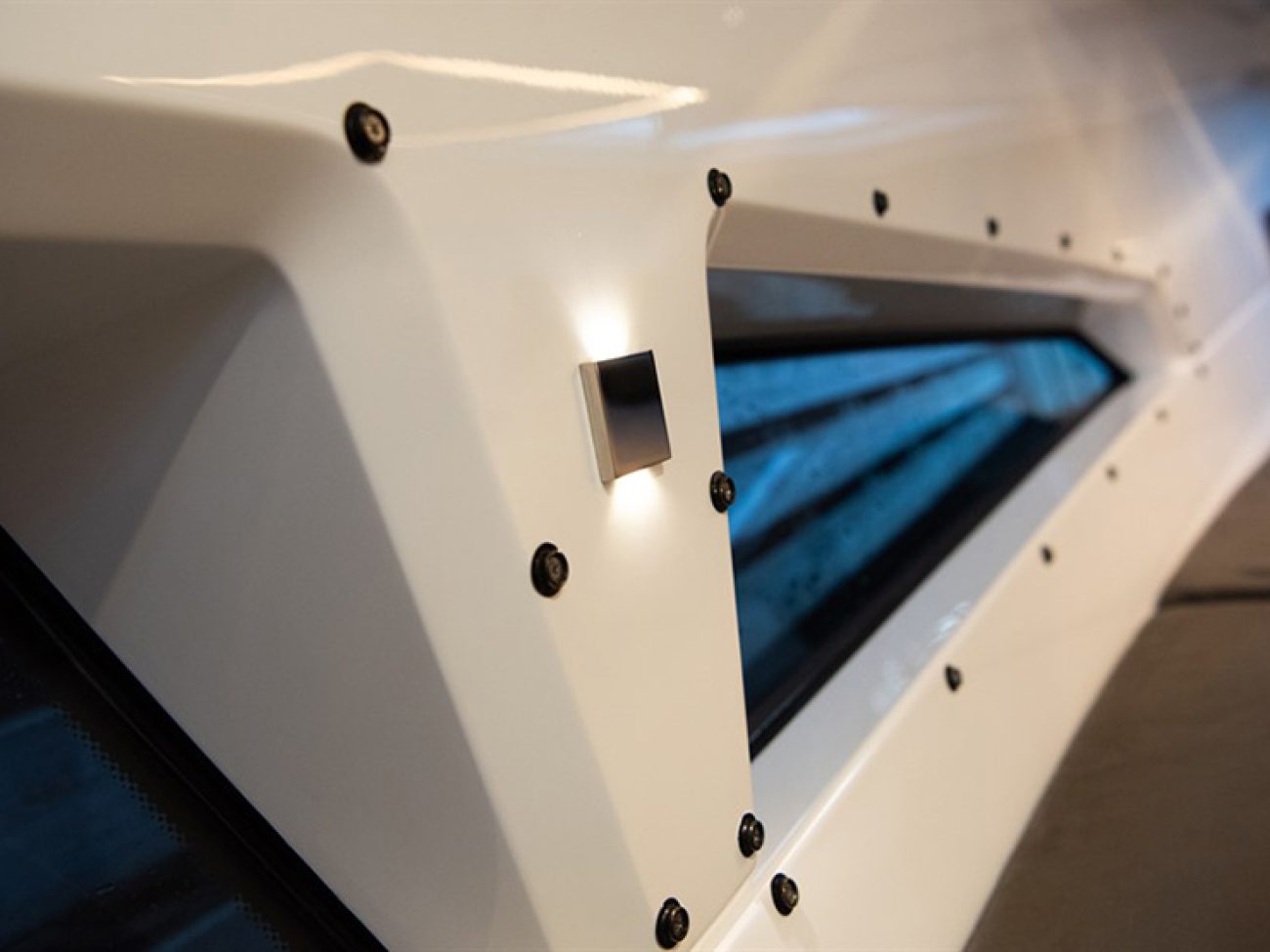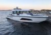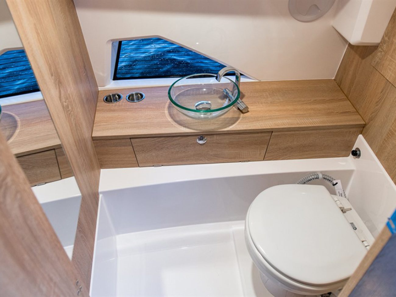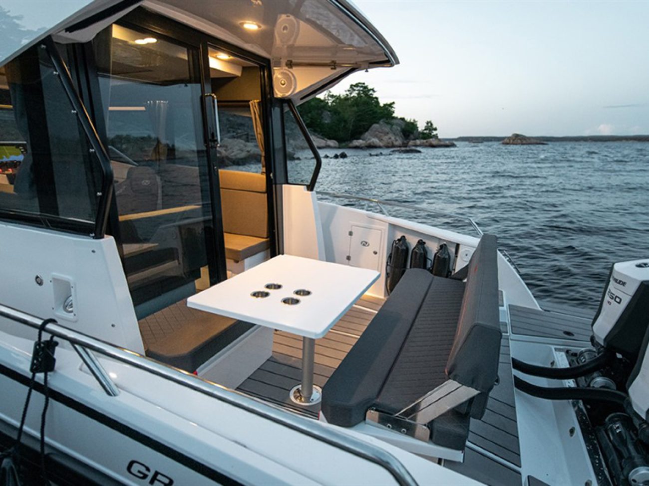 Un résultat a coupé le souffle, puisque ce bateau coupé, est familial et à la fois sportif , il a tout ce qu’il faut et ainsi il se démarque largement de la concurrence.Après plusieurs années de développement voici le nouveau bateau Nordkapp c’est aussi le premier bateau avec un toit et une aussi grande cabine avec salle de bain. En effet la hauteur dans la cabine est de 1,98m. Comme sa réputation, Nordkapp un bateau de qualité, solide et haut de gamme. Son isolation est remarquable, et sa navigation sensationnelle. Le Grand Coupé 905 est très maniable avec un très bon passage en mer ainsi un très bon angle d’attaque, à vitesse de croisière comme à grande vitesse, il sera ravir aussi bien le pilote que les passagers. Il serai impossible de décrire l’ensemble des équipements, ingéniosités ou détails, mais nous allons essayer de vous le présenter. A l’intérieur un cockpit complètement modulable.Un spacieux coin repas avec table et siège, plaque de cuisson ainsi qu’un frigo. Cet espace peut se transformer en canapé ou lit d’appoint. Le siège pilote a une ergonomie a couper le souffle et son tableau de bord a été pensé pour avoir un maximum d’équipements. Dans la cabine avec ses 1,98m de hauteur sous barreaux, une spacieuse cabine avec couchages. Un toit ouvrant sur l’extérieur, des lumières LED ainsi que de belles verrière. A tribord une salle de bain avec WC douche et lavabo, vous permettrons d’avoir tout le confort pour vos croisière en famille. De nombreuses ouvertures sur le Grand Coupé 905 rendent se bateau utilisable en toutes saisons, tout ouvert par beau temps, ou à l’abri lorsqu’il fait plus frais. Son toit électrique ouvrant, sa porte latérale tribord, sa porte arrière sur le pont permettent d’avoir de grands espaces conviviaux. En option la possibilité d’un taud de camping pour fermer le carré arrière et ainsi avec un espace extrêmement vaste. La partie arrière est complètement amovible. Tout peut-être enlever (banquette et table), et au contraire un bain de soleil bâbord peut-être installé, ainsi qu’une table.De larges passavants vous permettrons en toute sécurité de rejoindre le grand bain de soleil avant. On retrouve la marque de fabrique de l’esprit familial et sécuritaire avec ses hauts francs bords et de nombreuses mains courantes.