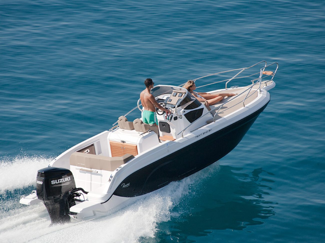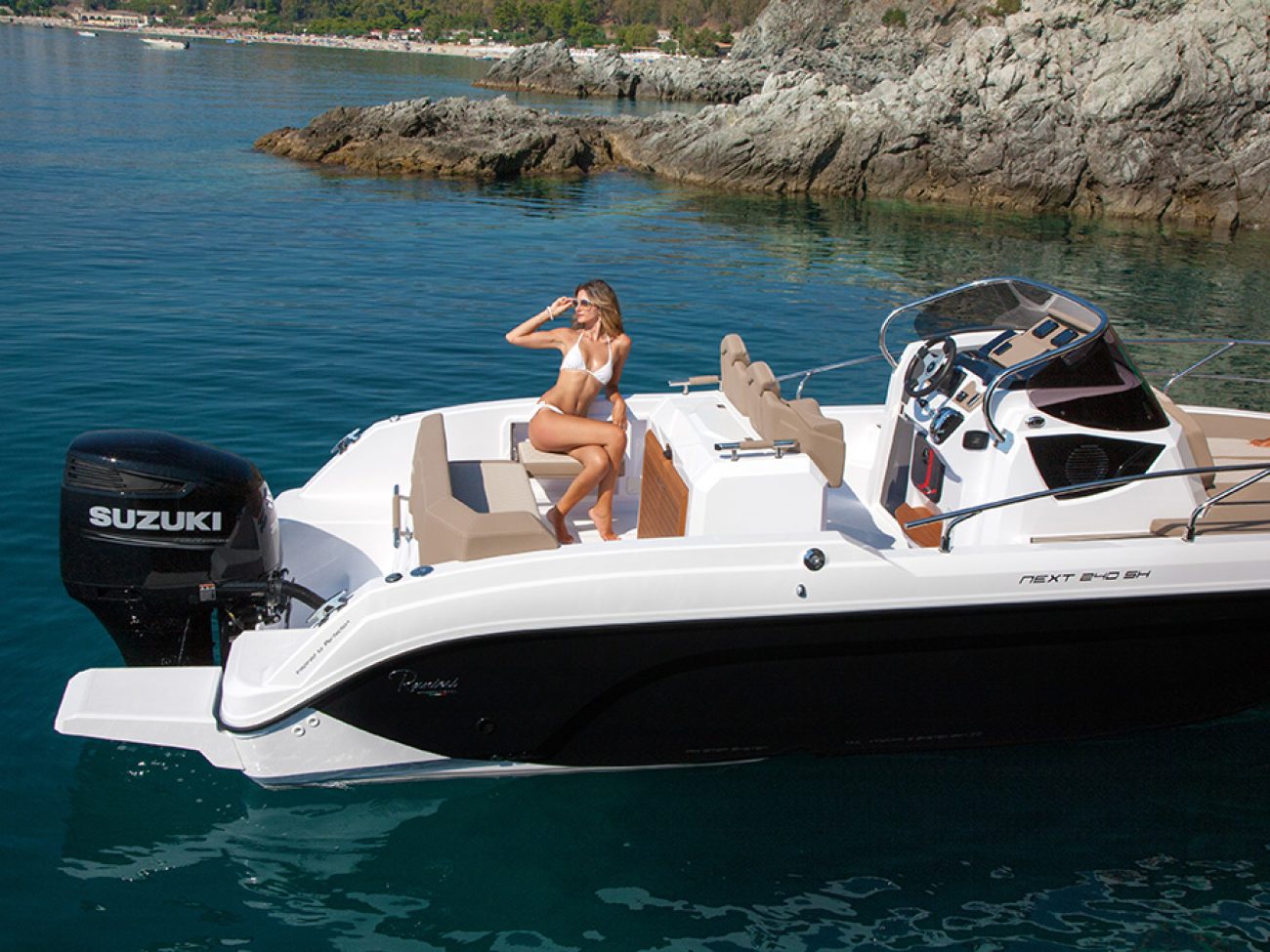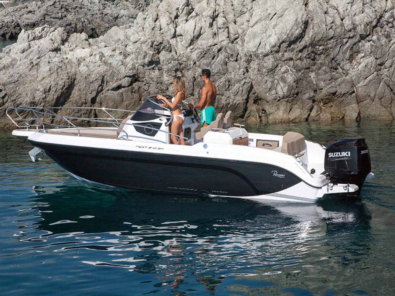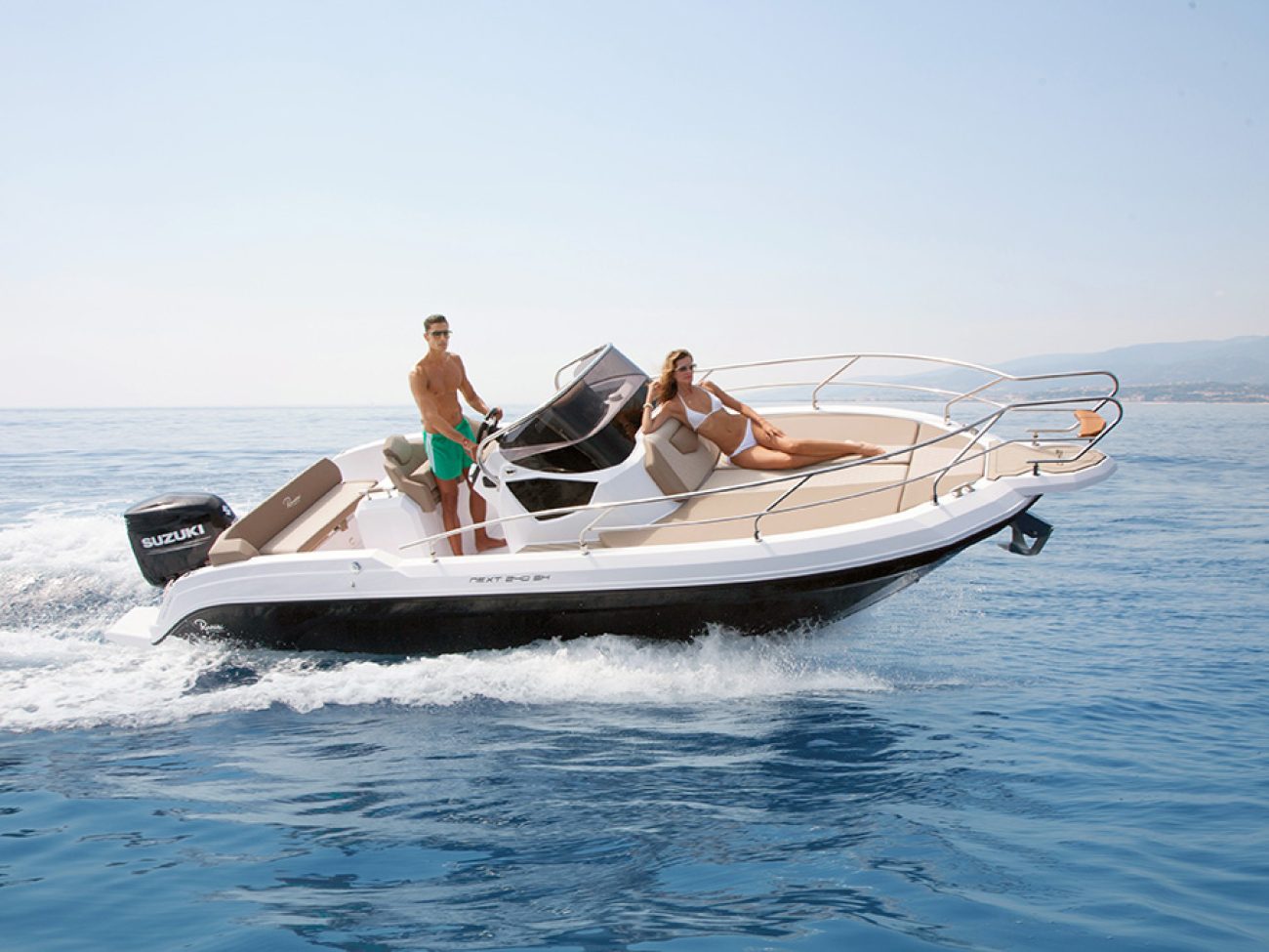 Un passage et des déplacements sereins, a la proue on retrouve cette belle delphinière qui permet un débarquement facile.De même que le Next 220 SH, le Next 240 SH peut se configurer de manière optimale afin d’accueillir jusqu’à 7 personnes, grâce à ses assises latérales basculantes, à sa banquette et aux sièges pilotes qui pivotent.