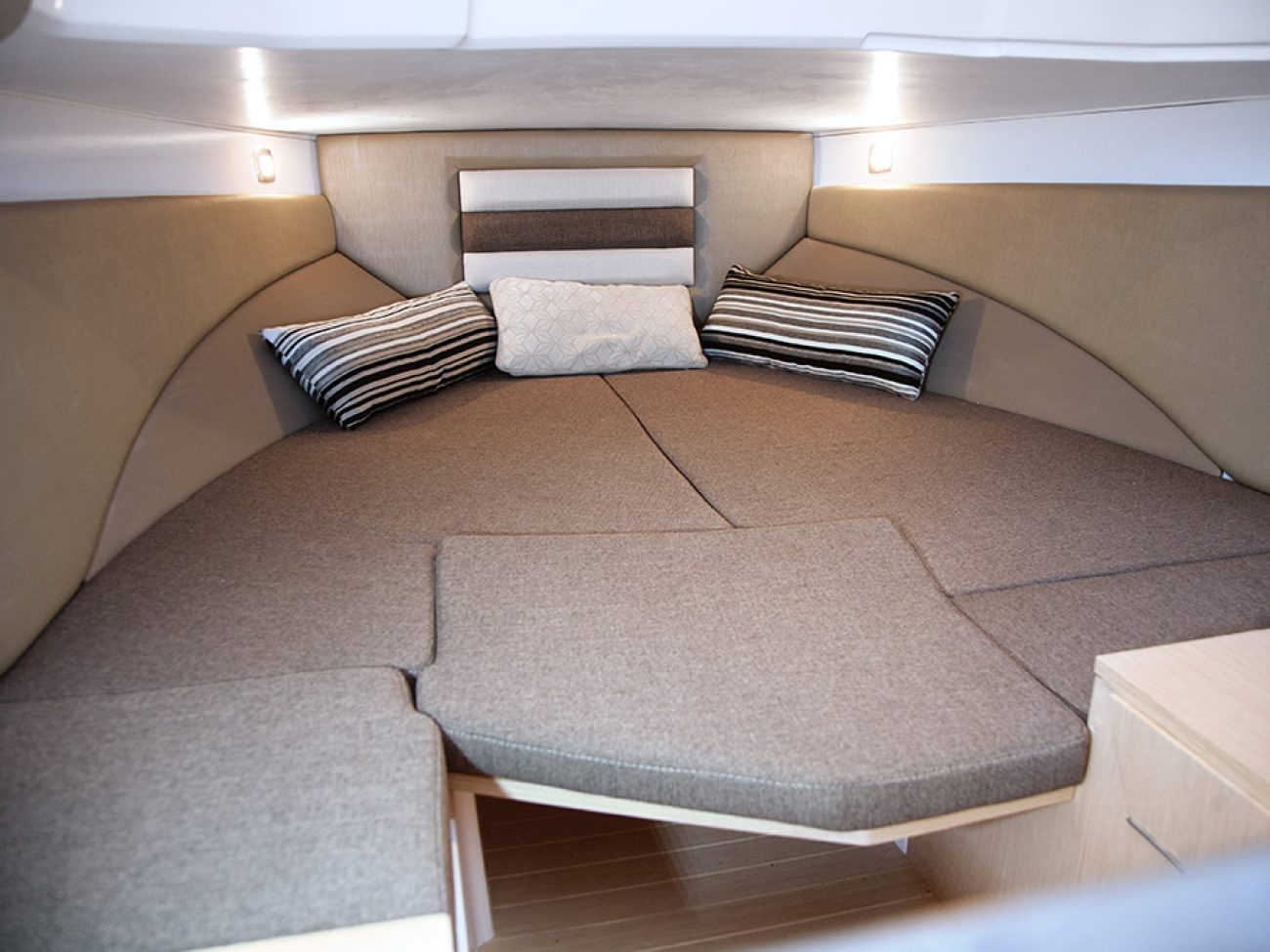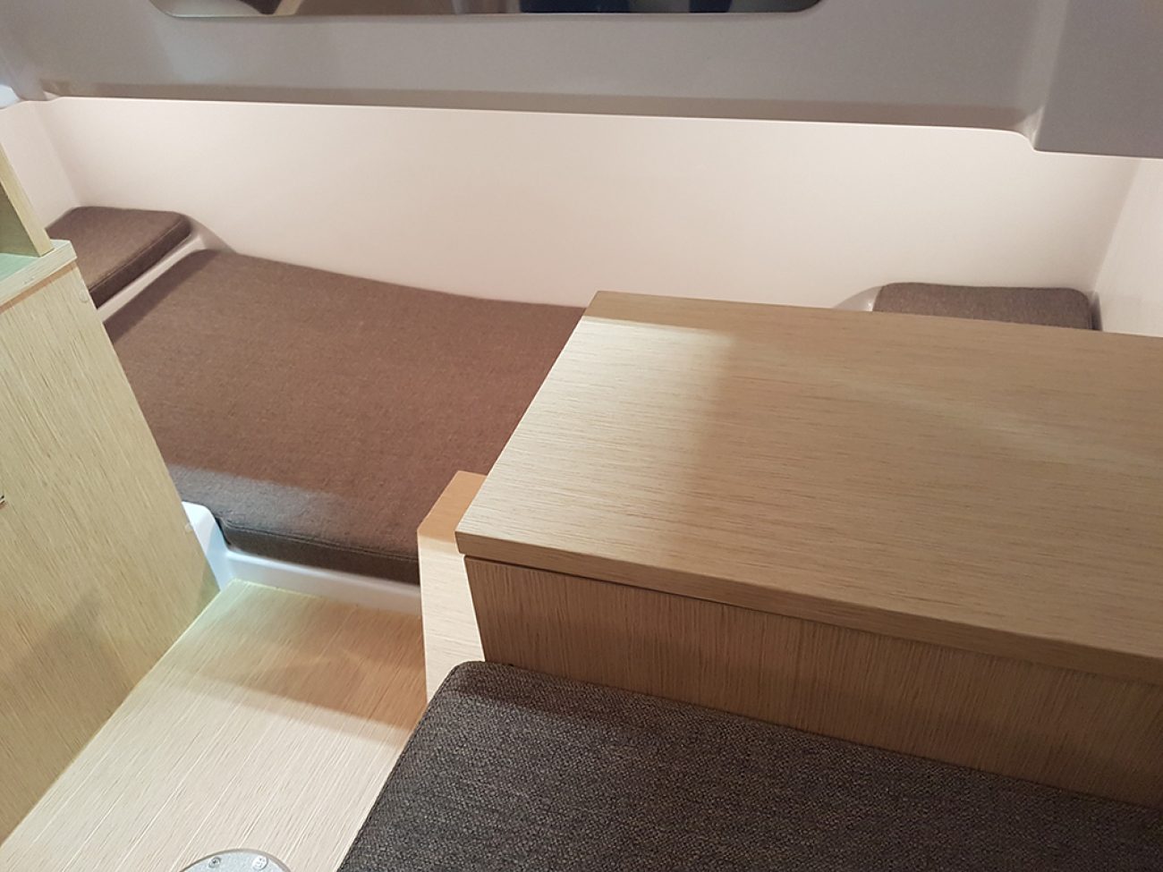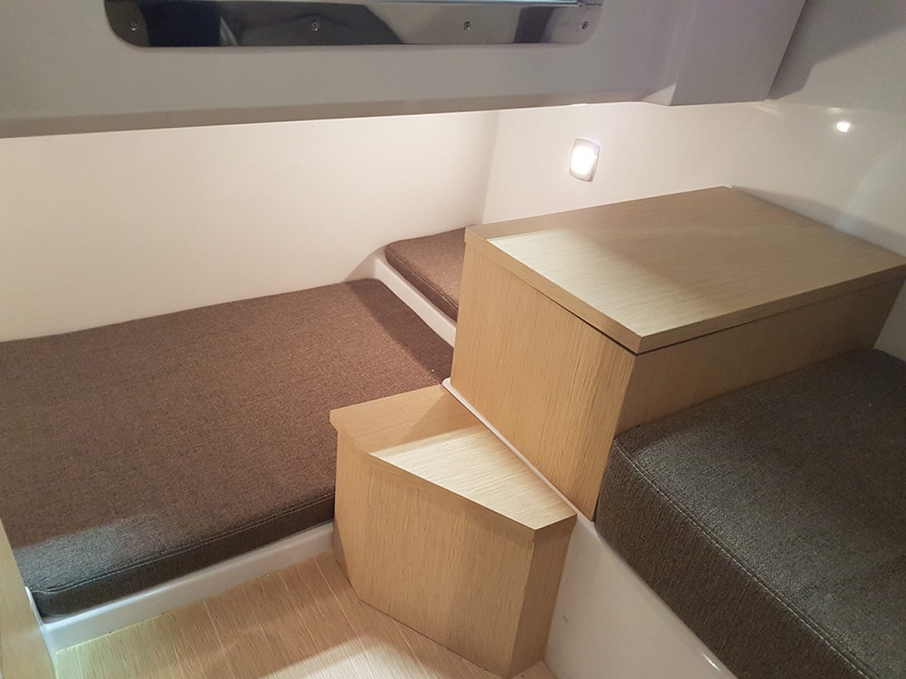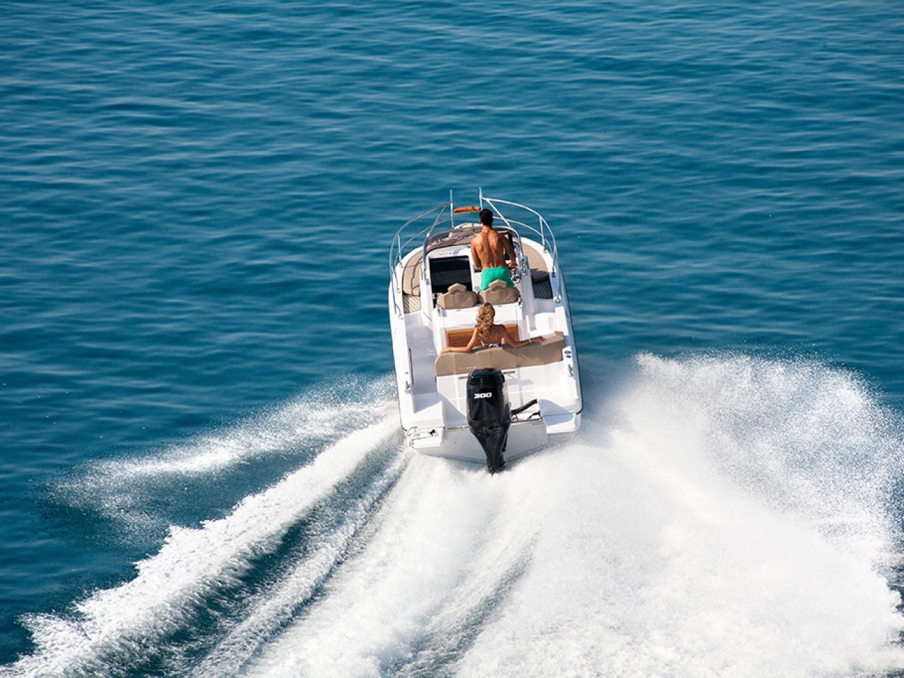 Autour du moteur, de belles extensions de plages arrières antidérapantes, donnent cette ligne séduisante au bateau. Elles permettent un passage facile et sécurisé pour la baignade avec son échelle incorporée a bâbord ainsi que sa main courante qui facilite le passage.
