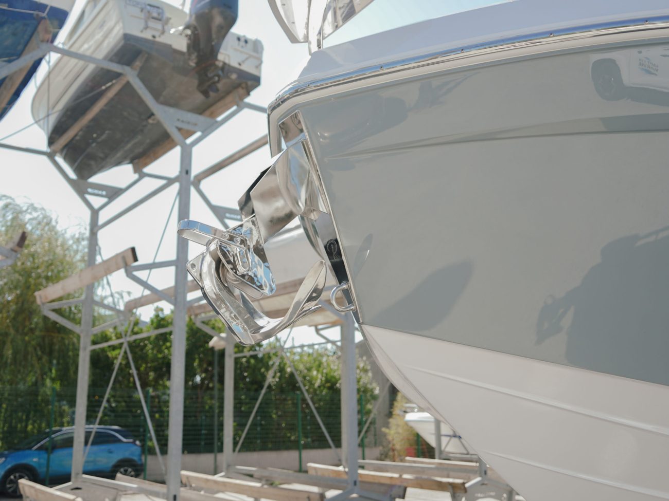 La montée à bord se fait par un accès pratique à bâbord ou l’on accède facilement au cockpit arrière, ainsi qu’a l’inverse à la descente pour se baigner.
