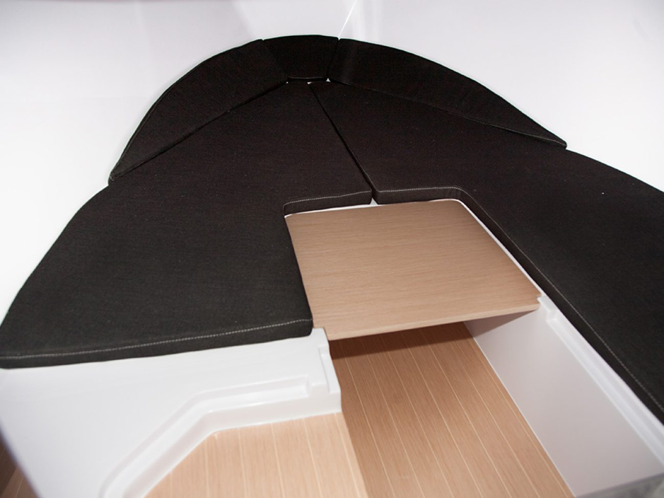 L’avant ponté avec son grand bain de soleil généreux et ses mains courantes sécurisantes offrent un maximum de confort. La cabine est toute aussi spacieuse car l’on retrouve un grand couchage, des rangements et la possibilité de WC.