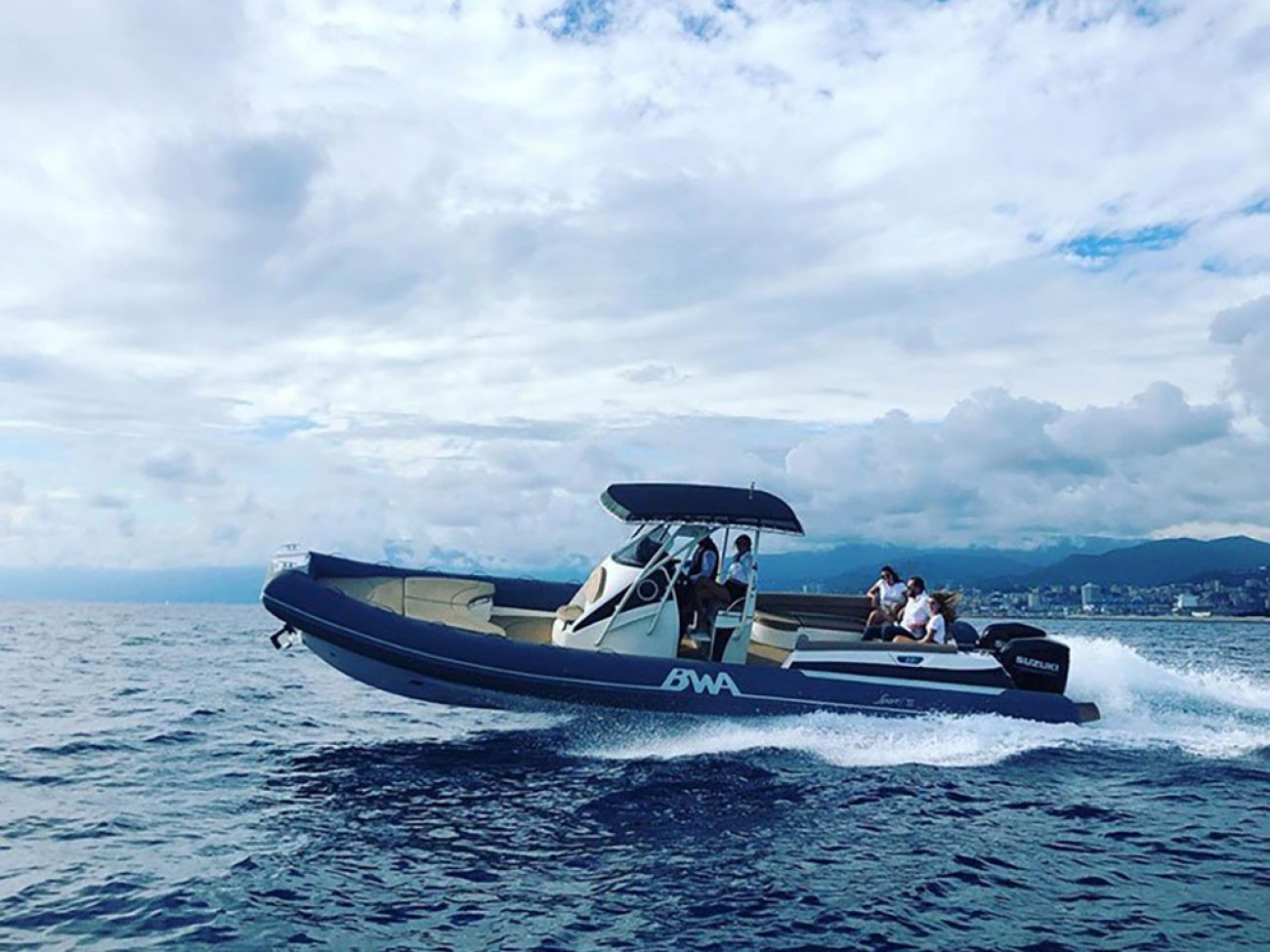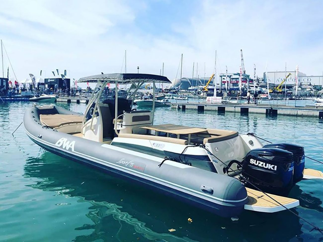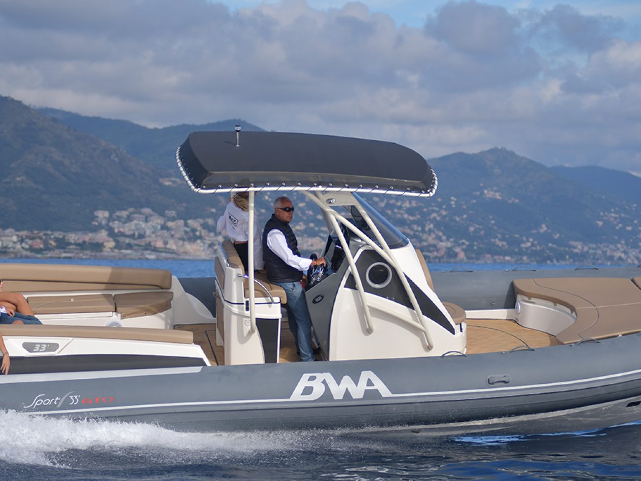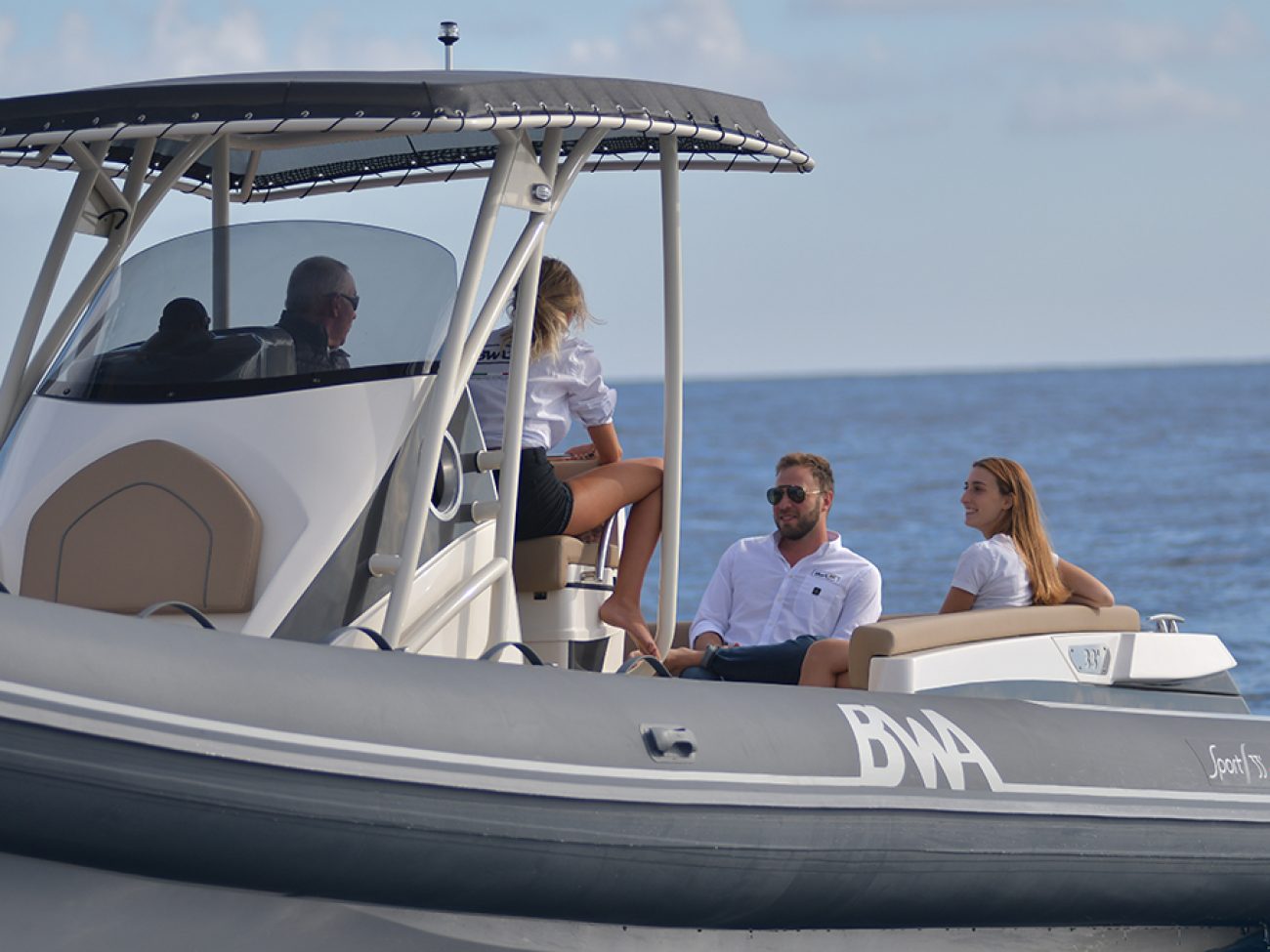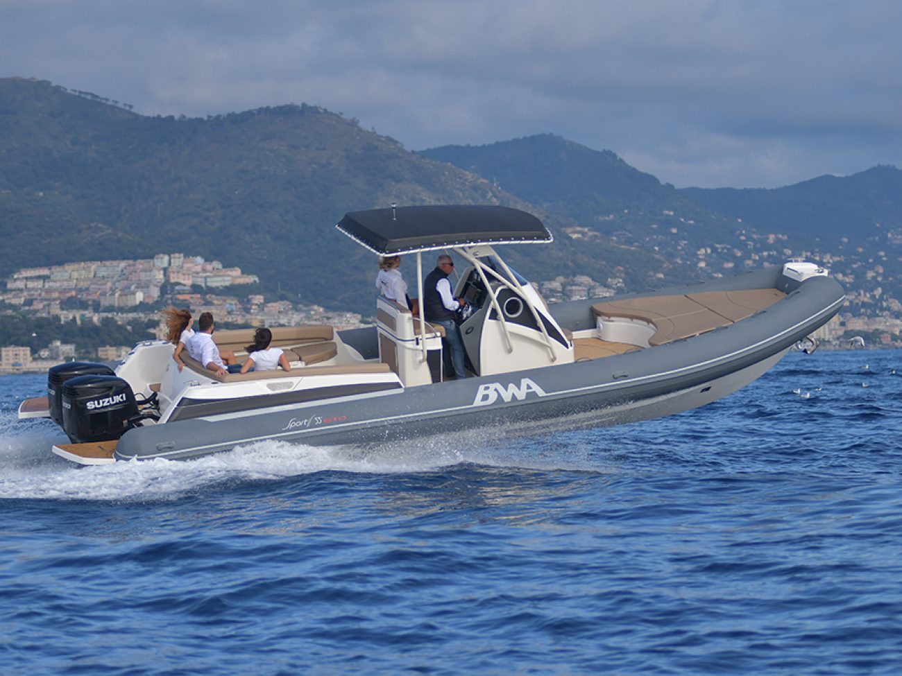 Pont en teck de série, console équipée de wc, lavabo et douche, guindeau électrique, planchettes de bain extra longues et la possibilité de personnaliser votre semi-rigide avec d’autres accessoires de confort.